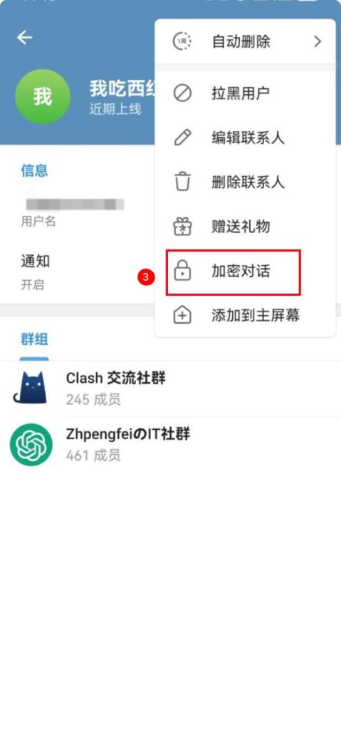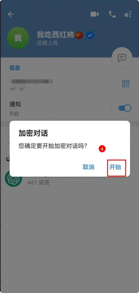 - Telegram电脑端加密对话的方法与手机端一样,点击好友头像进入主页-》点击三个点(更多)-》点击加密对话 -》会有弹窗询问是否开启-》点击开始-》进入私密聊天窗口