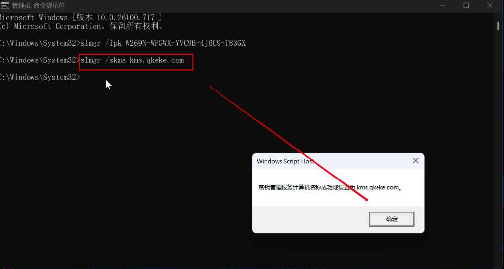 slmgr /skms kms.qkeke.com #如果kms.qkeke.com 地址不能用,请在下方备用地址换一个