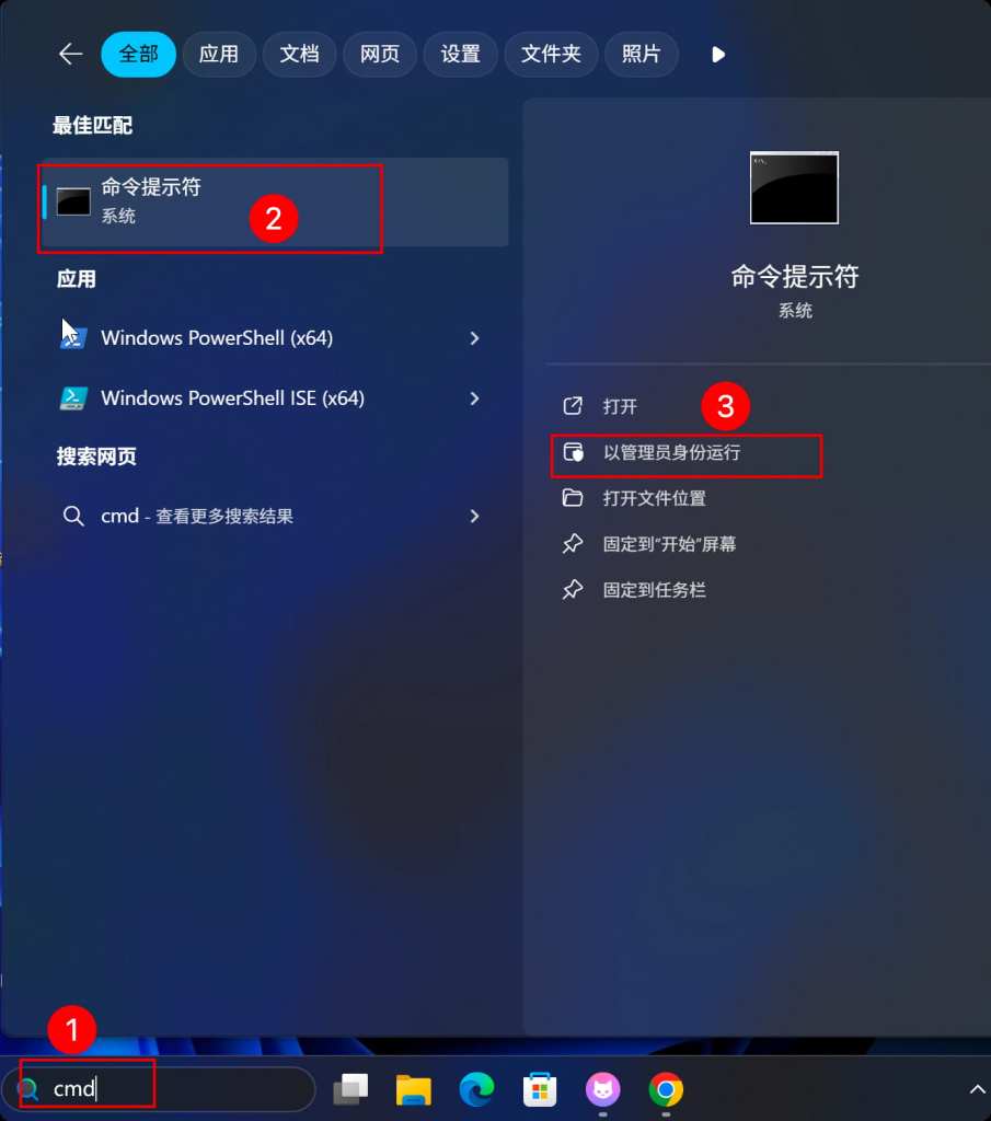 步骤一、底部搜索框输入cmd(或按下Win+X)-》命令提示符-》以管理员身份运行
